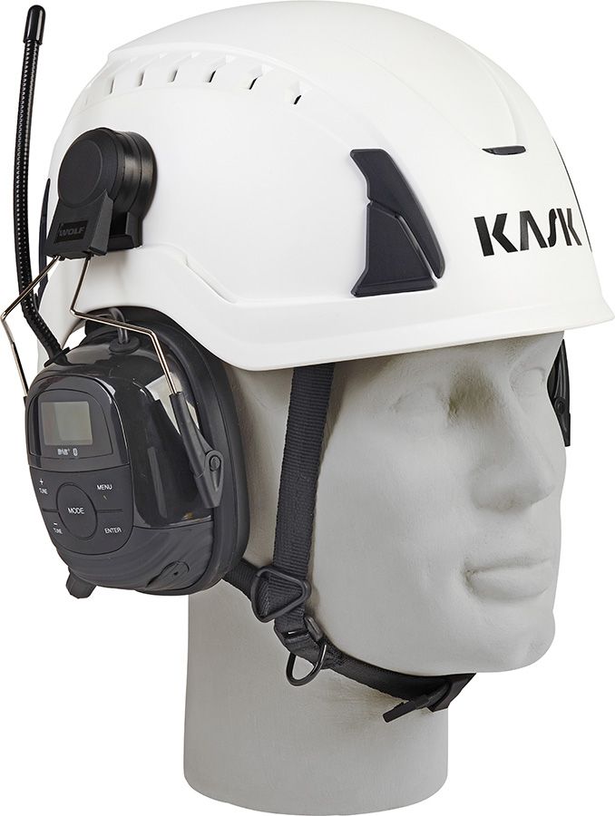 Das WOLF Headset PRO, Helmversion verbindet einen Kapselgehörschutz für Schutzhelme mit integrierter Audiofunktion. Es wird mit einem 30-mm-Anschlussclip am Helm befestigt und ist für gängige Sicherheitshelme vorgesehen. Damit bleibt der Gehörschutz am Helm, während Radio- und Bluetooth-Funktionen direkt im Headset integriert sind.