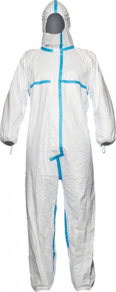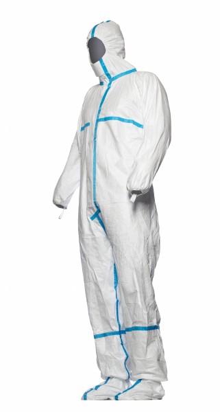 Combinaison de protection chimique types 4, 5 et 6 en nontissé TYVEK blanc, antistatique, capuchon élastifié, partie du cou montante, fermeture éclair à deux voies recouverte, toutes les coutures recouvertes d'une bande étanche, élastiques à la taille, aux poignets et aux chevilles, tailles M, L, XL et XXL.