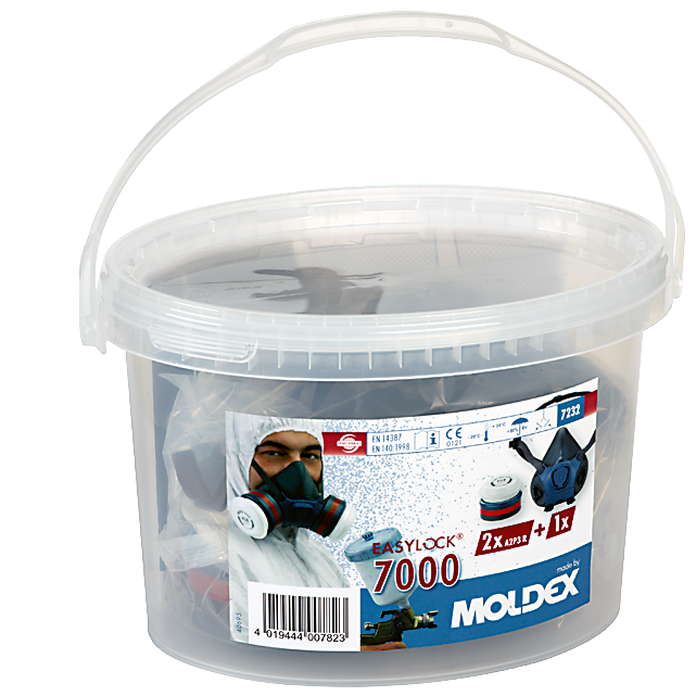 Demi-masque série 7000 MOLDEX, en trousse «READY PACK» pratique à fermeture hermétique. Cette trousse comprend les articles suivants: 1 pièce 266697-M Corps de demi-masque, 2 pièces 266701 Filtre à gaz A2, 2 pièces 26704 P3 Filtre à particules resp. préfiltre P3