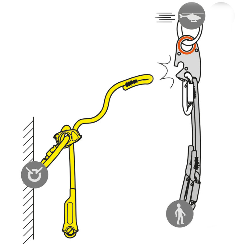 - Permet de sécuriser les phases de dépose et de reprise : si l'hélicoptère est amené à quitter brusquement sa position stationnaire, le brin réglable s'éjecte instantanément et libère ainsi la victime, le secouriste et l'hélicoptère.